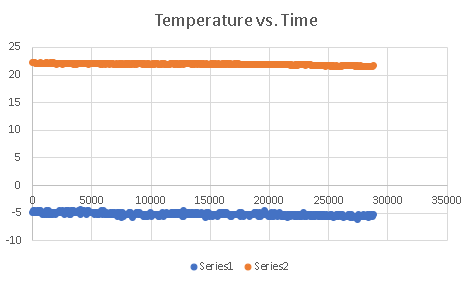 Since the sensor was placed in a room which was thermally regulated by a thermostat, the temperature vs. time plot is nearly a straight line. Same case with the MCU temperature readings as the temperature measured is internal to the microcontroller. The y-axis is temperature in degrees Celcius and the x-axis is time in seconds. The readings were taken in an 8-hour window from 2 pm to 10 pm. Series 1 is the internal temperature of the MCU (steady at rougly -5 degrees Celcius) and Series 2 is the readings from the temperature sensor (steady at roughly 22 degrees Celcius). The plot is shown in the figure below: